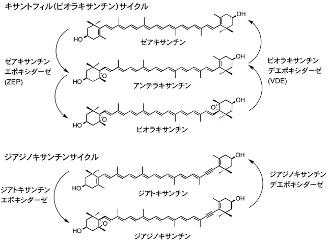 褐藻類や珪藻類など不等毛植物ではジアジノキサンチン/ジアトキサンチンがビオラキサンチン/ゼアキサンチンと同様なキサントフィルサイクル(エポキシ化/脱エポキシ化)を形成している.ただし関与する酵素はまだ同定されていない.両者を区別するために,前者をジアジノキサンチンサイクル,後者をビオラキサンチンサイクルと称することもある.