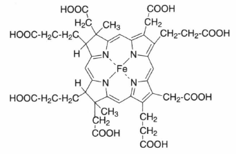 C42H44FeN4O16.分子量916.7. 亜硝酸レダクターゼ,亜硫酸レダクターゼがもつヘムの一種.ウロポルフィリノーゲンⅢからジヒドロシロヒドロクロリン,シロヒドロクロリンを経て合成される.シロヘム含有酵素は570~595 nm 付近に吸収極大をもつ(α吸収帯).大腸菌のシロヘム合成酵素(CysG)は3反応を1酵素で行う多機能酵素であるが,シアノバクテリア,高等植物での詳細はわかっていない.高等植物において初発反応を触媒するウロポルフィリノーゲンⅢメチルトランスフェラーゼがプラスチド内に局在することから,シロヘム合成はプラスチド内で行われると考えられる.