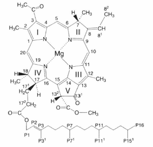紅色細菌RhodopseudomonasやThiocapsa属の数種に存在するクロロフィル.環Ⅱ(B環とも呼ばれる)にエチリデン基をもつ.C55H72N4O6Mg,分子量909.50.集光性および反応中心のクロロフィルとして機能.光や酸素に対して非常に不安定.環Ⅱの異性化によりクロリンに転化し緑となる.溶液の色は淡青紫.ジエチルエーテル中での吸収波長(分子吸光係数:M-1cm-1)は371 nm (7.72×104),406 nm (7.13×104), 796 nm (1.06×105). 酸化還元電位はEred= - 0.70 V vs. NHE(DMF).