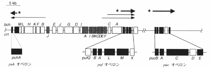 紅色細菌の染色体上では集光性バクテリオクロロフィルタンパク質複合体1(LH1)のαおよびβサブユニットの遺伝子pufA, pufBや反応中心のL, M,シトクロムサブユニットの遺伝子pufL, pufM, pufCが隣接して配置され,一つの転写単位を構成している.この転写単位をpufオペロンと呼ぶ(下図).反応中心のシトクロムサブユニットを欠く種ではpufCは見られず、代わりにRhodobacter属などではpufX遺伝子が配置されている.種によってはpufBの上流域にpufQ遺伝子が配置されていたり,pufBとpufAが複数組含まれていることもある.多くの種ではpufオペロンの近傍ににバクテリオクロロフィルaやカロテノイドの合成に関与する酵素をコードする遺伝子が多数存在しており,この領域を光合成遺伝子クラスターと呼ぶことがある.下図はRhodobacter capsulatusの光合成遺伝子クラスターとpucオペロンを示し,嫌気環境下でRegB/RegA二成分制御系によって転写が促進される領域の開始点に*を付した.