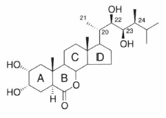 アブラナ科の花粉からステロイド骨格をもつ生理活性物質として単離され,光形態形成に関与することから最近植物ホルモンの一種として認められた.生理作用として細胞伸長,細胞分裂,屈曲促進,ソース/シンク相互関係,木部分化,プロトンポンプの活性化,エチレン合成促進,老化促進(または抑制),抗ストレス作用などがある.