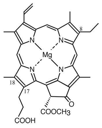 ポルフィリンD環のC17-C18結合が二重結合のクロロフィルの生合成中間体.626 nm 付近に特有の吸収極大をもち,そのモル吸光係数は30.4×103(80%アセトン中)である.光依存型プロトクロロフィリドレダクターゼ(LPOR)もしくは光非依存型プロトクロロフィリドレダクターゼ(DPOR)により,クロロフィリドaに変換される.被子植物はプロトクロロフィリド還元系としてLPORのみを有するため,暗所ではプロトクロロフィリドが大量に蓄積し黄化する.黄化葉のエチオプラストではプロトクロロフィリドはLPORとNADPHとの三者複合体を形成し,特有の格子状構造をもつプロラメラ体の主要成分となる.LPORと結合した基質プロトクロロフィリド自身が光依存的反応の光吸収を担う発色団としての役割も果たす.キュウリやダイコンなど多くの植物の黄化葉では,C8位がビニル基である3,8-ジビニルプロトクロロフィリドの蓄積も検出される.