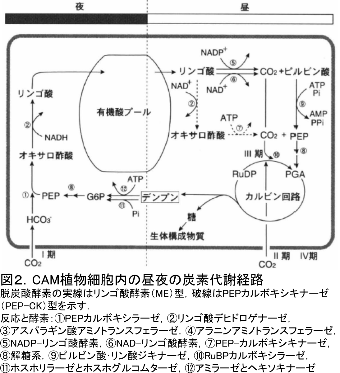 Ⅰ期)夜間に気孔を開き,空気中からCO2を細胞質ホスホエノールピルビン酸カルボキシラーゼ(PEP-C)により固定し,主にリンゴ酸を液胞に蓄える.ホスホエノールピルビン酸(PEP)と還元力NADHはデンプンの分解と解糖系により供給される.リンゴ酸は液胞膜のエネルギー依存(ATP,ピロリン酸)プロトン(H+)ポンプにより能動輸送されて液胞内のpHは4以下になり,有機酸の蓄積量は生重量の2〜3%に達する.