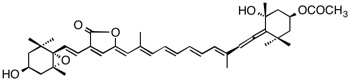 カロテノイドの一種.渦鞭毛植物のみがもつ特異な構造のカロテノイド.他の系統群では存在が知られていない.他のカロテノイドが炭素数40の化合物であるのに対して,C-12’,13’,20’が欠失した炭素数37のカロテノイドである.トレーサー実験ではゼアキサンチンがネオキサンチンを経てペリジニンに変化した.水溶性のペリジニン-クロロフィルaタンパク質複合体(PCP)は三量体構造を取り,単量体には8分子のペリジニンと2分子のクロロフィルaが結合している.このカロテノイドからクロロフィルaへの励起エネルギー移動効率はほぼ100%ときわめて高いことが知られている.このエネルギー移動過程はフェムト秒分光法によって解明されており,ペリジニンの禁制の第一励起準位からクロロフィルaの許容の第一励起準位へ起こることが示された.