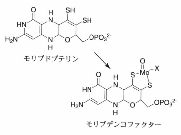 1982年にRajagopalanらにより,下図のようなモリブデンを配位するジチオレン基と末端にリン酸エステルをもつ新規なプテリンがニワトリ肝の硫酸レダクターゼやキサンチンオキシダーゼのモリブデンコファクター(MoCo)の構造研究の過程で見いだされた.このプテリンは従来から知られているプテリン化合物とは異なるので,モリブドプテリンと命名された.モリブデンはそれ自体では生物的な活性はないがMoCo(モリブドプテリン, Mo-MPT)として機能する. Mo-MTPは酵素タンパク質の内部に存在し,このMo-MTPのプテリンリング系がモリブデン原子からあるいはモリブデン原子への電子伝達に関わっていると考えられている.植物の硝酸レダクターゼやキサンチンオキシダーゼ,アルデヒドオキシダーゼなどのモリブデンを補因子とするような酵素や,好熱菌から見いだされているギ酸デヒドロゲナーゼやカルボン酸レダクターゼのようなタングステンを補因子とするような酵素に含まれる.