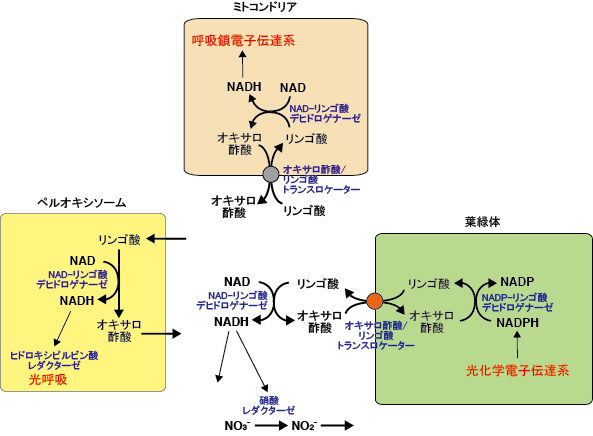 細胞内の還元力は,還元力輸送シャトルを介して細胞内コンパートメント間を移動し,利用あるいは散逸される.葉緑体においては,光化学反応で生じた還元力の一部がサイトソルへ排出され,硝酸レダクターゼなどの酵素反応に利用される.また,ストロマ内の過剰還元力蓄積に伴う酸化傷害を回避するリンゴ酸バルブとしてもリンゴ酸-オキサロ酢酸シャトルが機能している.暗所下の葉緑体や従属栄養組織の色素体において還元力が必要な場合,還元力輸送シャトルを介して還元力が供給される.ミトコンドリアへの還元力供給,ミトコンドリアからの還元力排出もリンゴ酸-オキサロ酢酸シャトルが関与していると考えられている.リンゴ酸バルブにより葉緑体外へ排出された過剰還元力は,シャトルによりミトコンドリアに取り込まれ,呼吸鎖電子伝達系で散逸される.逆に,ミトコンドリア内の還元力がシャトルを介して排出され,利用される.光呼吸のグリコール酸回路のうちペルオキシソームで起こるヒドロキシピルビン酸レダクターゼの反応には還元力が必要であり,ミトコンドリアおよび葉緑体内の還元力がリンゴ酸-オキサロ酢酸シャトルを介して排出され,ペルオキシソームに送られて利用される.