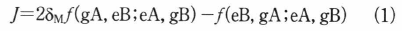 である.δMはスピン一重項状態では1,三重項状態では0となる. f(gA,eB;eA,gB)とf(eB,gA; eA,gB)はそれぞれ交換およびクーロン積分の非対角項となっている.両分子のHOMO (highest occupiedmolecular orbital)波動関数をそれぞれΨA(r)およびΨB(r), LUMO (lowest unoccupied molecular orbital)波動関数をそれぞれφA(r)およびφB(r)とする.(縮退があったとしても適当な一次結合により)これらをすべて実関数に採る.このとき