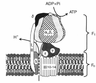 ATP合成酵素は,生体膜に埋め込まれたFo部分(エフオーと読む.oはミトコンドリアのATP合成酵素がオリゴマイシン(oligomycin)感受性であることに由来する)と膜表在性のF1部分から成る.Fo部分はH+の通り道であり,葉緑体の場合には4種類のサブユニット(Ⅰ, Ⅱ, Ⅳ各1個と14個のⅢからなる),ミトコンドリアや細菌では3種類のサブユニット(a1b2c8~13)で構成されている.葉緑体のサブユニットⅠは,ミトコンドリアなどのaに,サブユニットⅠとⅡはbにそれぞれ対応する.葉緑体のサブユニットⅢ,ミトコンドリアや細菌のサブユニットcは,いずれも2本のαヘリックス構造から成る膜タンパク質で,C末端側のヘリックスのほぼ中央部には,H+の輸送に直接関与しているアスパラギン酸またはグルタミン酸が存在する.このサブユニットは,8~15個(この数は生物種によって異なることが明らかになっている)が集まって膜内にリング構造を形成している.F1部分はα3β3γ1δ1ε1というサブユニット構成で,βサブユニットにはATP加水分解や合成の際の触媒部位が存在する.一方,αサブユニットはβサブユニットと構造のよく似たタンパク質であり,やはりヌクレオチド結合部位をもっているが,触媒活性はもたない.このヌクレオチド部位へのヌクレオチド(主にADP)の結合が酵素活性の調節に関与していると考えられている.1分子のATP合成酵素には3個の触媒部位があり,これらは互いに強い協同性をもって順番に触媒反応を行っている.ATP加水分解反応の研究によって,この順番に起こる反応は,分子の中央に位置しているγサブユニットの回転と共役していることが明らかにされた.葉緑体のATP合成酵素はチオレドキシンによる還元によって活性を調節されるチオール調節酵素であり,この調節に関与するシステインはγサブユニットにある.暗所で光合成電子伝達系からの還元力の供給が不十分になるとこのシステインは酸化されてジスルフィド結合を形成し、ATP合成酵素のATP加水分解活性を阻害する.