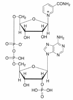 NADP(H) NADの五炭糖(ペントース)に図のようにリン酸基が1つ付加した化合物.酸化還元反応は, NADP+ + 2e- + H+⇔NADPHである.NADと同様,生体の多くの酸化還元反応に関与している補酵素であるが,光合成における関与の主なものは,酸素発生型光合成生物の最終的な電子受容体として,還元型フェレドキシンからフェレドキシン-NADP+オキシドレダクターゼ(FNR)の触媒によって電子を受け取り還元される.NADPHは還元的ペントースリン酸回路によって酸化され二酸化炭素を還元する.また,C4経路のNADP-リンゴ酸酵素による二酸化炭素還元系の補酵素として働く.さらに,葉緑体呼吸の基質としての機能,光化学系Ⅰの周りの循環的電子伝達およびそれに共役したCO2の輸送の関与が示されている.