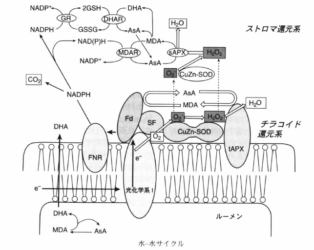 ペルオキシダーゼ反応で生ずるAHは植物,真核藻類ではモノデヒドロアスコルビン酸(MDA)であり,主にFdによって光化学系Ⅰ複合体の近くで,反応(a)で生じた4電子のうち,残りの2電子によってAsAに還元される.