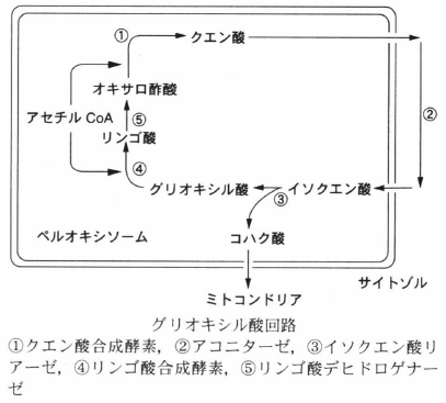 植物,微生物に存在する脂肪酸から糖への変換に働く代謝系であり,植物ではグリオキシソームに局在し,イソクエン酸リアーゼ,リンゴ酸合成酵素,リンゴ酸脱水素酵素,クエン酸合成酵素,アコニターゼから成る.このうち,アコニターゼのみ細胞質に存在する.同じくグリオキシソームに局在するβ酸化系から供給されるアセチルCoAを利用して最終的にコハク酸を生成する.コハク酸はミトコンドリアへと移行し糖新生に利用され,同時に生成するグリオキシル酸は,再びグリオキシル酸回路の基質となる.回路が一巡すると2分子のアセチルCoAから1分子のコハク酸が生成する.脂肪性種子植物の発芽時および老化時に,グリオキシル酸回路の各酵素が誘導され代謝活性が上昇する.光合成能を有していない発芽直後の幼植物体のエネルギー生成にとって不可欠な脂肪酸代謝系の一翼を担っている.