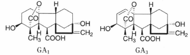 植物ホルモンの一種.イネ馬鹿苗病菌(Gibberella fujikuroi)が生産する徒長を誘導する毒素として1926年に発見された.ジベレリンはジテルベン化合物でent-ジベレランを基本骨格とする.多数の同族体があるため,慣用的には登録申請順に番号が与えられており, GA1のようにAに番号を付けて表記する.ジベレリン酸はGA3.ジベレリンはレタス,シロイヌナズナなどの光発芽種子の発芽誘導,イネ,オオムギ種子の糊紛層のα-アミラーゼの誘導,茎葉部の伸長と抽苔の促進,花の分化,雄性促進,種子の成熟促進作用を示す.生合成の欠損した突然変異体は節間が短く,葉は野生種に比べ濃い緑色になり,雄性不稔を示すものが多い.