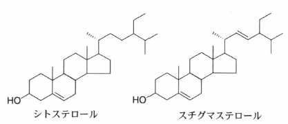 ステロイド類の一種.ステロイド類はシクロペンタノフェナントレン環を骨格としてもつ化合物の総称で,そのうち炭素数が27~30で3位にヒドロキシ基をもつものをステロールという,動物細胞では炭素数27のコレステロールが最も含量が高いが,植物では種や組織の違いにより,様々なタイプのステロールが存在し,これらはフィトステロールと総称されている.高等植物に主要なステロールとしてシトステロール,カンペステロール,スチグマステロールがあり,また組織によってはそれらの配糖体も多量に存在する.植物ホルモンであるブラシノステロイドはカンベステロールを前駆体として合成される.植物におけるステロールの合成はメバロン酸経路により行われる.すなわち,アセチルCoAを出発物質として,細胞質(小胞体膜)に存在するHMG-CoAシンターゼとHMG-CoAレダクターゼの作用によりメバロン酸が生成され,さらにメバロン酸から生成されるイソペンテニル二リン酸(IPP)の連続的な重合反応によりスクアレンが生成し,さらにその環化反応によりシクロアルテノールが最初に合成される.シロイヌナズナでステロール合成系の変異株が多数とられており,それらの一部はプラシノステロイド欠損変異株と同様な表現型を示すが,生合成の初期段階のものはプラシノステロイドの欠損だけでは説明できない異常な表現型を示す.このことから,ステロールにはプラシノステロイドの前駆体としての機能だけでなく,それ自身に重要な生理機能があると考えられる.