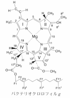 ヘリオバクテリアに特有なクロロフィルで,バクテリオクロロフィルbと同じく環Ⅱ(B環とも呼ぶ)にエチリデン基をもつ.長鎖アルコールはファルネソール.C50H58MgN4O6,分子量819.34.光捕集の機能をもつ.光や酸素に対して非常に不安定.環Ⅱの異性化によりクロロフィルaになる.溶液の色は淡青紫.ジエチルエーテル中での吸収波長(相対強度)は364 nm(0.94), 565 nm(0.31), 767 nm(1.00).