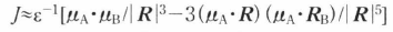 となり,分子間距離|R|の3乗に反比例する.ここで√2の因子は1分子につきHOMO電子2個が光学遷移に寄与することに起因し,εは周辺媒質の静誘電率である.波動関数の対象性によりAとBの一方または両方が禁制遷移のときには当該のμが0なので,さらに高次の展開が必要で,Jは遷移四重極子・双極子や四重極子・四重極子相互作用の形になり,|R|のそれぞれ4乗と5乗に反比例して減衰する.