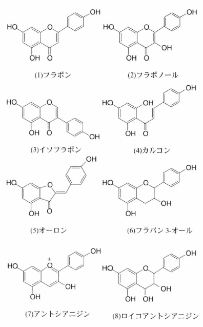 植物の二次代謝産物の代表的な化合物であるフェニルアラニン由来の桂皮酸類と3分子のマロニルCoAから生合成され,C6-C3-C6の15個の炭素原子から成る基本骨格をもつ一群の植物由来のフェノール性化合物の総称.基本骨格の炭素原子には水酸基,メトキシル基,分枝炭素鎖などが結合している.フラボノイド類は,骨格中央の3個の炭素原子がつくり出している構造部分によりさらに細かく分類され,主な化合物として(1)フラボン, (2)フラボノール, (3)イソフラボン, (4)カルコン, (5)オーロン, (6)フラバン3-オール(カテキンなど), (7)アントシアニジン, (8)ロイコアントシアニン(プロアントシアニン)などに分類される.なお,フラボノールやアントシアニジンなどは,通常は配糖体として存在しており,後者はアントシアニンと呼ばれる.フラボノイド類は蘚苔類以上の植物に広く分布しており,特に葉や茎などの表皮細胞には高濃度に存在し,通常,紫外線領域部に強い吸収をもつので,太陽光からの有害紫外線を吸収する働きをしていると考えられている.さらに,花や果実の着色の色素,フィトアレキシン,摂食阻害物質などの働きをするものもあり,今日までに4,000種類を越える化合物が報告されている.