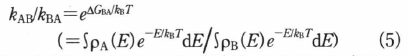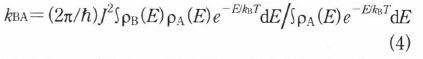 である.ρA(E)とρB(E)はそれぞれ|A>と|B>の状態密度関数で,ともに積分が1に規格化されている.逆過程の遷移確率kABはAとBを入れ換えて得られる.両者間には化学平衡の法則