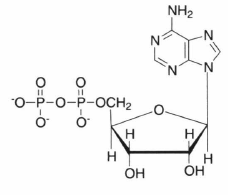 ADP アデノシン5'-二リン酸(adenosine 5'-di-phosphate)の略称.リン酸と結合することでATPを生じるが,この反応は吸エルゴン反応(標準自由エネルギー変化:+ 30.5kJ mol-1)であり,何らかのエネルギーの供給がないと起こらない.ADPは, ATPがATPaseの働きによって分解されたときに生じるほか,アデニレートキナーゼによってATPとAMPからも生じる.真核細胞内の主なATPの供給源は,ミトコンドリアと葉緑体である.ミトコンドリアでつくられたATPがマトリックス外に運ばれるときには,ATP/ADP交換輸送体によりADPがATPに対して対向輸送される.