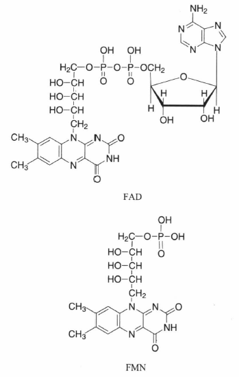 FAD フラビンアデニンジヌクレオチド(flavin adenine dinucleotide)の略称. FMNはフラビンモノヌクレオチドの略称.ともにイソアロキサジン環にリビトールが結合したリボフラビン(ビタミンB2)を基本骨格とする.通常はフラビンタンパク質と高い親和性で非共有結合をして, FMNとともに生体の多くの酸化還元反応に関与している.光合成の電子伝達系では,還元型フェレドキシンNADP+との反応を触媒するフェレドキシン-NADP+オキシドレダクターゼ(FNR)の補欠分子族(FAD)として働いている.電子伝達体以外では,光回復酵素の光受容色素(FAD)として,さらに光情報伝達系では,胚軸伸張の抑制に関与するクリプトクロムや(FAD),光屈性,葉緑体の光定位運動,気孔の開閉に関与するフォトトロピンの光受容色素(FMN)として機能している.