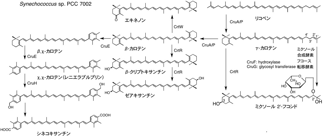 Synechococcus sp. PCC 7002においても生合成経路と酵素が調べられているが、他のシアノバクテリアと違いが見られ,ミクソール合成の水添加酵素(CruF)と糖転移酵素(CruG)が見つかったが,シアノバクテリアに共通かは判らない.