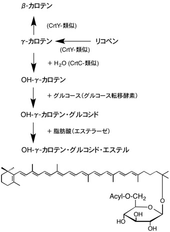 緑色硫黄細菌のChlorobium tepidumでは酵素・遺伝子が調べられ,生合成経路がほぼ判明した.リコペンの生合成には植物型のCrtP, CrtQ, CrtHが関与する.次いでリコペンの片方あるいは両方の末端基が,リコペンβ-シクラーゼ(CruA)によりβ末端基に変換し,さらにイソレニエラテン合成酵素(CrtU)により芳香環のφ末端基に変換して,クロロバクテンあるいはイソレニエラテンが合成される.種により片方のみあるいは両方のカロテンをもつ.γ-カロテンとクロロバクテンに水添加酵素(CrtC),糖転移酵素(CruC),エステル化酵素(CruD)が働き,カロテノイド配糖体エステルを合成する.リコペンシクラーゼ(CruA)はCrtY/CrtLとは相同性がない.4種類のカロテンは主にクロロソームに,カロテノイド配糖体エステルは細胞膜に存在する.