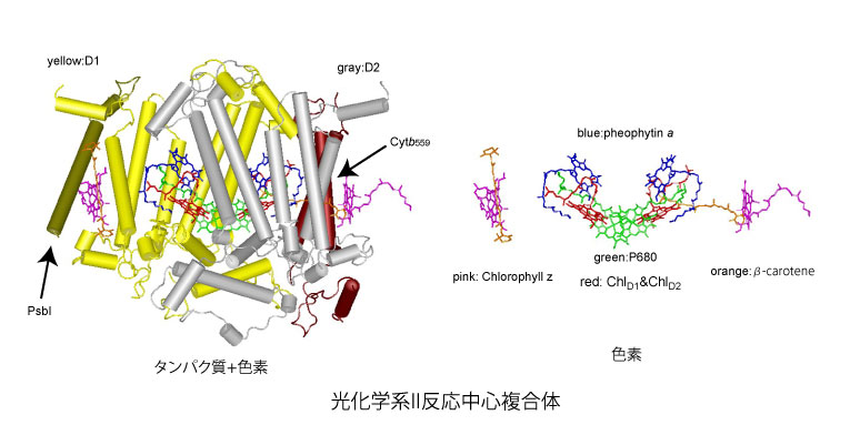 D1/D2/シトクロムb559複合体は,紅色細菌の光化学反応中心の中核を成すLサブユニットおよびMサブユニットと相同性をもつD1タンパク質(psbA遺伝子産物)およびD2タンパク質(psbD遺伝子産物)を中心に構築されており,低分子量のタンパク質成分としてαおよびβサブユニット(それぞれ,psbEおよびpsbF遺伝子産物)より成るcytochrome(シトクロム)b559とpsbI遺伝子産物を含んでいる(真核生物では,これらの5つの成分はすべて葉緑体遺伝子にコードされている).この複合体は,色素成分として反応中心当たり6分子のクロロフィルa,2分子のフェオフィチンa,2分子のβ-カロテンを含んでいる(α-カロテンしか持たない種ではα-カロテン)。機能的には,一次電子供与体と一次電子受容体(フェオフィチンa)との間の初期電荷分離反応の活性を保持している.この標品にはMn4CaO5クラスターおよび二次電子受容体(QAキノン電子受容体)、三次電子受容体(QBキノン電子受容体)として機能するプラストキノンが欠けているため,人工的電子供与体や人工的電子受容体が存在しない条件下では,強光照射時に高い確率で初期電荷対が再結合してクロロフィルの三重項状態を形成する.