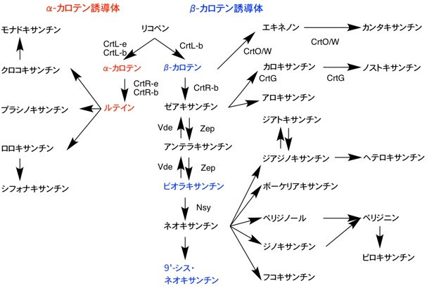フィトエンの生合成とリコペンの生合成によりリコペンが合成される.リコペンのΨ末端基がリコペンβ-シクラーゼ(CrtL, CrtY)により環化してβ末端基に変わり,γ-カロテンを経てβ-カロテンが合成される.この遺伝子は陸上植物(crtL),シアノバクテリア,好気性光合成細菌(crtY)から単離されて相同性がある.一方,リコベンのΨ末端基をε末端基に変えるリコペンε-シクラーゼ(CrtL-e)は陸上植物からのみ単離されている.リコペンのみ基質になってδ-カロテンが合成されるが,γ-カロテン,δ-カロテンは基質にならない.δ-カロテンは次にCrtL-bによりα-カロテンに変わる.またβ-カロテンはβ-カロテン水酸化酵素(CrtR-b, CrtR)によりゼアキサンチンになる.この遺伝子は陸上植物,シアノバクテリアから単離されている.一方,α-カロテンはCrtR-bとε-カロテン水酸化酵素(CrtR-e)によりルテインになる.ゼアキサンチンはゼアキサンチンエポキシダーゼ(ZEP)によってアンテラキサンチンを経てビオラキサンチンに変わる.強光条件ではビオラキサンチンデエポキシダーゼ(VDE)が逆反応を行い,キサントフィルサイクルはこの2種類の酵素により調節される.最後にビオラキサンチンは9'-シス-ネオキサンチンに変わる.ネオキサンチン合成酵素(NSY)が同定された.また葉緑体のネオキサンチンはすべて9'-シス型であることからシス異性化酵素もあると考えられている.CrtL-b,CrtL-e,NSYは互いに酵素の反応機構が似ており,またアミノ酸配列に相同性がみられる.特に活性中心部分は一部のアミノ酸の置換があるのみである.同一機能をもつ酵素が複数存在する種,葉緑体と色素体で使い分けている種もある.