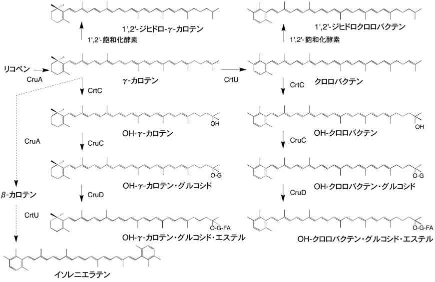 緑色硫黄細菌のChlorobium tepidumでは酵素・遺伝子が調べられ,生合成経路がほぼ判明した.リコペンの生合成には植物型のCrtP, CrtQ, CrtHが関与する.次いでリコペンの片方あるいは両方の末端基が,リコペンβ-シクラーゼ(CruA)によりβ末端基に変換し,さらにイソレニエラテン合成酵素(CrtU)により芳香環のφ末端基に変換して,クロロバクテンあるいはイソレニエラテンが合成される.種により片方のみあるいは両方のカロテンをもつ.γ-カロテンとクロロバクテンに水添加酵素(CrtC),糖転移酵素(CruC),エステル化酵素(CruD)が働き,カロテノイド配糖体エステルを合成する.リコペンシクラーゼ(CruA)はCrtY/CrtLとは相同性がない.4種類のカロテンは主にクロロソームに,カロテノイド配糖体エステルは細胞膜に存在する.