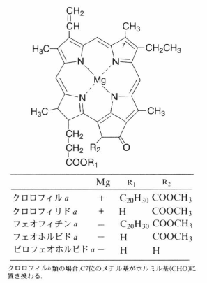 C35H36N4O5,分子量592.3. クロロフィルaのフィチル基が脱離し,さらに中心金属のMgが2個の水素原子に置き換えられた誘導体(下図参照).クロロフィルaに比べて比較的安定で,吸収ピークは元のクロロフィルと大きく異なり,ジエチルエーテル中で409,505, 534, 609, 667 nm にある.生体ではこの誘導体はクロロフィラーゼと低分子の金属脱離物質によるMgの脱離反応で生じると考えられているが,非酵素的に強酸処理によっても生成する.Mgの脱離に関しては,以前にマグネシウムデケラターゼの存在が示唆されているが,その実体はわかっていない.ピロフェオホルビドaはフェオホルビドaのC132位のメトキシカルボニル基が水素原子に置き換わったもの.